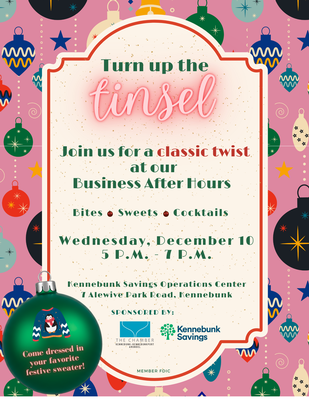 Let's turn up the tinsel! Join Kennebunk Savings for an unforgettable Holiday Business After Hours. Sip on refreshing drinks and savor gourmet bites surrounded by tinsel inspired décor. Amidst the chaos of the holidays, this will be the perfect evening escape!