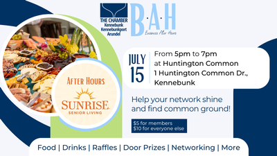 Join us on Wednesday, July 15th for Business After Hours at Huntington Common - Sunrise Senior Living in Kennebunk. There will be live music, a thoughtfully curated menu, drinks, dessert, raffle prizes and more!