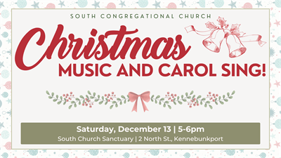 Join us on Saturday, December 13th for Christmas music and a carol sing from 5-6pm at South Congregational Church!