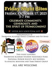 Thornton Academy is excited to welcome the community back for Friday Night Bites on Friday, October 17,2025 from 5 to 7 PM at 438 Main Street in Saco, kicking off Homecoming Weekend with an evening full of delicious food, family fun, and school spirit.