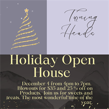 Join us to celebrate the most wonderful time of the year! Turning Heads Hair Studio come get a $35 wash and blow dry and 25% off product. Come and join us for sweets and treats. December 4 at 4 to 7 PM.