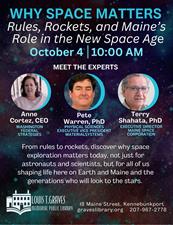Saturday, October 4, 10 AM. Why Space Matters: Rules, Rockets, and Maine’s Role in the New Space Age. Join us for an engaging panel featuring three experts who bring unique perspectives on the future of space exploration. Together, they’ll explore how international space law is being written in real time, how the space economy is opening new opportunities — including right here in Maine — and how the work of rocket scientists and engineers is making the impossible possible. From rules to rockets, discover why space exploration matters today, not just for astronauts and scientists, but for all of us shaping life here on Earth and the generations who will look to the stars. The Louis T. Graves Memorial Public Library is located at 18 Maine Street, Kennebunkport. For further information, please call 207-967-2778 or visit www.graveslibrary.org.